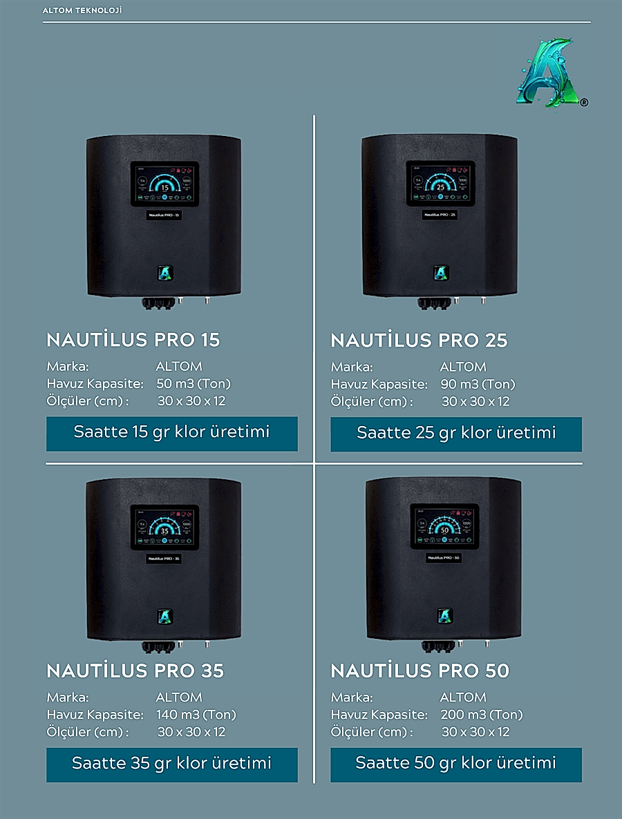 NAUTİLUS PRO AİLESİ 5 inç dokunmatik ekran Altom pH kontrol ekleme imkanı Altom ORP (Redox) kontrol ekleme imkanı Bipolar tuz hücresi tasarımı Kendi kendini temizleyen tuz hücresi Susuz çalışma önleyici Geri yıkama uyarı sistemi Düşük üretim uyarı sistemi Havuz pompası otomatik kontrol Havuz ışıkları otomatik kontrol Ekstra 2 adet otomatik kontrol Her otomatik kontrol için 2 farklı zamanlayıcı imkanı Çift dil desteği (Türkçe – İngilizce) 5000 saat ömürlü tuz hücresi Adresinizde servis